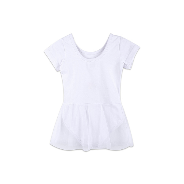 Белое трикотажное боди с коротким рукавом и прозрачной юбкой – подходящий вариант одежды для занятий танцами, гимнастикой или балетом. Модель простая и одновременно праздничная. Все благодаря легкой юбке, которая надежно пришита на поясе.