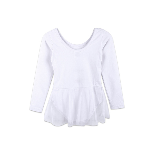 Трикотажное боди с длинным рукавом и юбкой создано специально для юных спортсменок. Комплект белого цвета выполнен из хлопка с добавлением эластана. На поясе пришита прозрачная легкая юбка. Идеальный вариант для занятий балетом, танцами, гимнастикой или другими дисциплинами, требующими определенного внешнего вида. Боди также возможно использовать и в повседневной жизни. Это универсальная модель, которую удобно носить дома, в гостях или в качестве праздничного костюма.