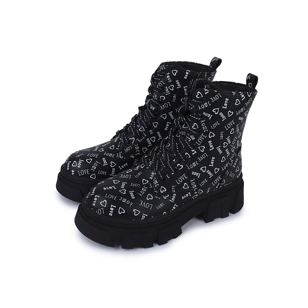 Верхняя часть ботинок изготовлена из искусственной кожи, которая обеспечивает защиту от влаги и грязи, помогая сохранить ноги сухими. Стильный черный фон с белыми надписями и рисунками сердечек понравится девочке.