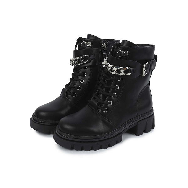 Модные демисезонные высокие ботинки для девочек школьного возраста. Модель в черном цвете с невысоким, но массивным каблуком. У изделия есть декоративные элементы в виде серебристой толстой цепочки, ремешков и шнуровки. Застегивается обувь с помощью удобной молнии сбоку.