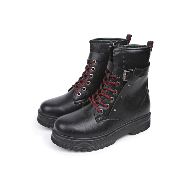 Красивые и стильные высокие ботинки изготовлены из кожи практичного черного цвета, поэтому понравятся каждому ребенку. Подкладка обуви отделана текстильным материалом на основе натурального хлопка. В качестве декоративных элементов использованы яркая красная шнуровка и крупная регулируемая пряжка на передней поверхности обуви. Для комфортного обувания на боковой поверхности вставлена застежка-молния, котораяя процесс обувания. Высокий фактурный протектор завершает привлекательный молодежный образ. Модель подойдет для девочек школьного возраста.