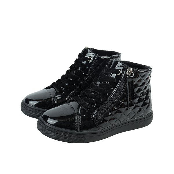 Эффектная модель утепленных ботинок для девочек из черной лаковой искусственной кожи понравится каждой моднице. Аккуратный закругленный мысок и толстая прорезиненная подошва придают ботинкам лаконичный вид. Декоративная шнуровка выполнена бархатной лентой черного цвета. В качестве застежки предусмотрена молния по наружной боковой стороне. Такая глубокая застежка под углом позволяет обуть ребенка легко и быстро. Дополняет декор удлиненная петля на застежке. Задняя часть ботинок выполнена в стеганом стиле, используется форма небольших квадратов. Внутренняя отделка трикотажная с утеплением.