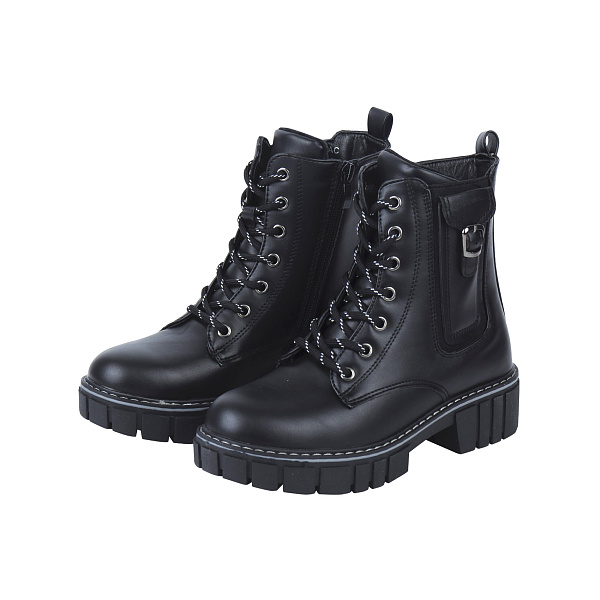 Стильные ботинки гармонично впишутся в гардероб девочки школьного возраста. Модель подкупает лаконичным дизайном. В качестве украшения использована металлическая пряжка и имитация кармана в боковой части.
