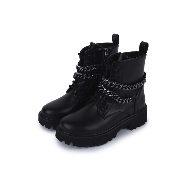 Декоративные крупные металлические цепочки придают обуви особый шарм и делают ее модной деталью гардероба. Шнуровка и боковая молния обеспечивают плотное прилегание ботинок к ноге и облегчают процесс надевания и снятия обуви.