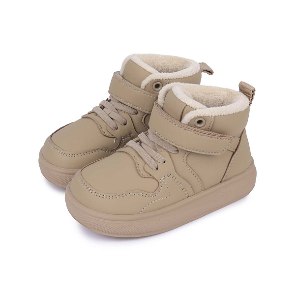 Утепленные ботинки для мальчика ясельного возраста изготовлены из искусственной кожи бежевого цвета. Внутренняя часть ботинок выполнена из сочетания 80% хлопка и 20% полиэстера, что обеспечивает отличное сохранение тепла и вентиляцию. Легкая и прочная подошва из термопластичного эластомера (ТЭП) гарантирует удобство и долговечность в использовании.