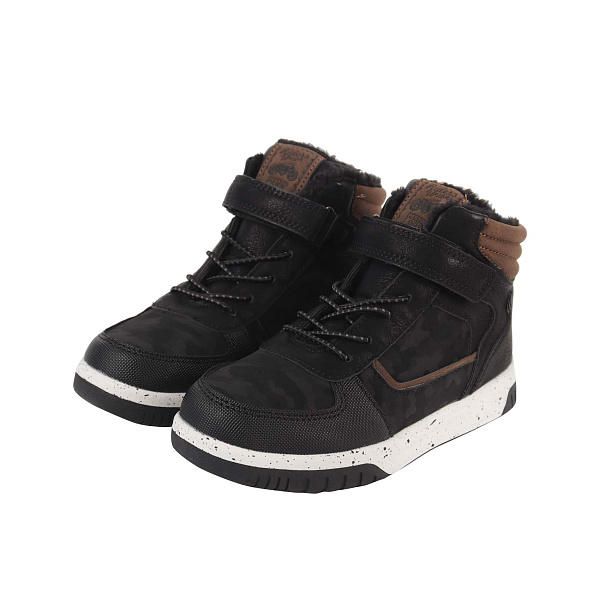 Стильные демисезонные ботинки для мальчика выполнены в черном цвете с коричневыми элементами. Верх изготовлен из искусственной кожи и текстиля. Материалы защищают ноги от влаги и ветра, просты в уходе и долговечны. Подкладка и стелька выполнены из текстиля, что позволяет циркулировать воздуху и поддерживать оптимальный микроклимат внутри ботинок. Съемная стелька упрощает процесс сушки после игр и прогулок на дождливой улице.
