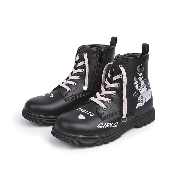Стильные черные ботинки для девочек дошкольного возраста украшены трендовым принтом розовых цветов и шнурками в тон. Шнурки используются для регулирования обуви по полноте, а для комфортного обувания на внутренней поверхности модели расположена молния. Ботинки изготовлены из кожи, а для отделки подкладки обуви использован мягкий трикотажный материал на основе натурального хлопка. Хлопок чудесно впитывает излишнюю влагу и дарит детским ножкам чувство комфорта до конца дня. Рельефный протектор из полиуретана равномерно распределяет нагрузку на ноги, формирует правильную форму стопы, не скользит на асфальте или плитке. Пятка приподнята на небольшой каблук, а стелька оснащена специальными подушками.