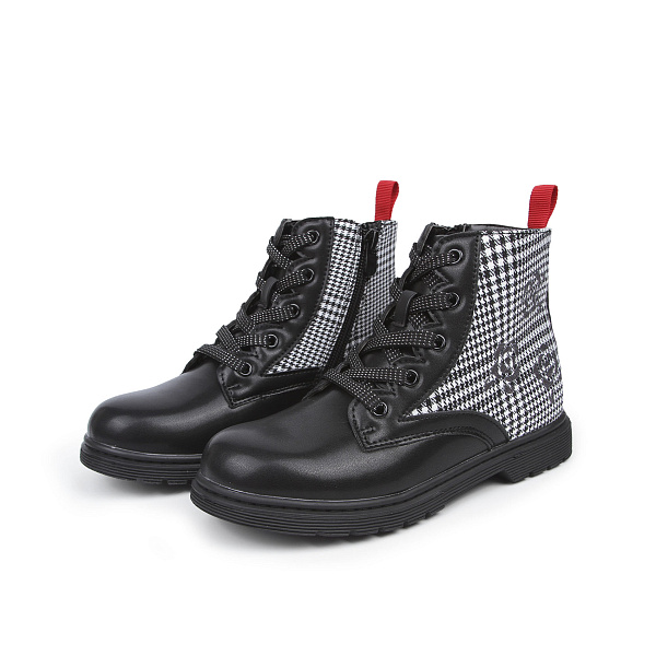 Комбинированные ботинки для девочек дошкольного возраста изготовлены из прочной кожи. Основной цвет обуви – черный, для придания ботинкам декоративности и выразительности использована кожа с печатным нанесением мелкой клетки. Ботинки смотрятся модно и привлекательно, поэтому они понравятся девочкам. На передней поверхности ботинок размещена функциональная шнуровка, а на внутренней поверхности обуви – застежка молния, ускоряющая обувание. Для прочности ботинки прошиты по краю подошвы. Высокий протектор с рельефным рисунком не скользит при ходьбе, а сама подошва немаркая. Подкладка обуви отделана хлопковым трикотажным материалом, который обеспечивает естественную вентиляцию ног.