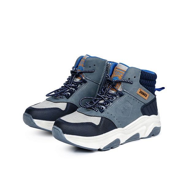 Высокие спортивные ботинки для мальчика младшего возраста выполнены в серо-черной цветовой гамме с белыми и сиими элементами. Сочетание различных фактур и оттенков дало модные ботинки современного вида, которые регулируются по полноте при помощи эластичной шнуровки с карабином и имеют застежку-молнию на внутренней стороне.
