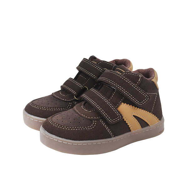 Ботинки для мальчиков — это практичная и стильная обувь в коричневом цвете с бежевыми акцентами, выполненная в спортивном дизайне с элементами кроссовок. Верх модели сочетает искусственную кожу и текстиль, а на язычке и заднике — мягкий флис для дополнительного комфорта. Широкие липучки обеспечивают надежную и быструю фиксацию, а контрастная подошва придает изделию современный вид. Объемный берцовый срез и эргономичный силуэт делают обувь удобной для активных прогулок и повседневного использования.