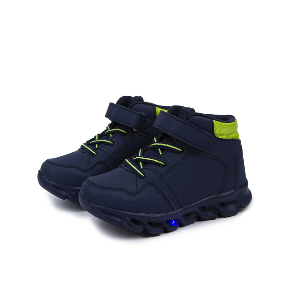 Модные и технологичные ботики для малышей станут чудесным дополнением к гардеробу. Детские ботинки оборудованы осветительными элементами, которые включаются при ходьбе. Практичный темно-синий цвет делает их немаркими и облегчает уход за обувью. В качестве декоративных элементов использованы яркие шнурки и текстильные вставки. Ботинки удерживаются на ноге при помощи шнуровки и застежки-липучки. Обувь изготовлена из кожи, в подкладка осуществлена хлопковым текстильным материалом. Хлопок бережно впитывает лишнюю влагу, помогая ногам ребенка оставаться сухими и здоровыми. Рекомендовано для детей ясельного возраста.