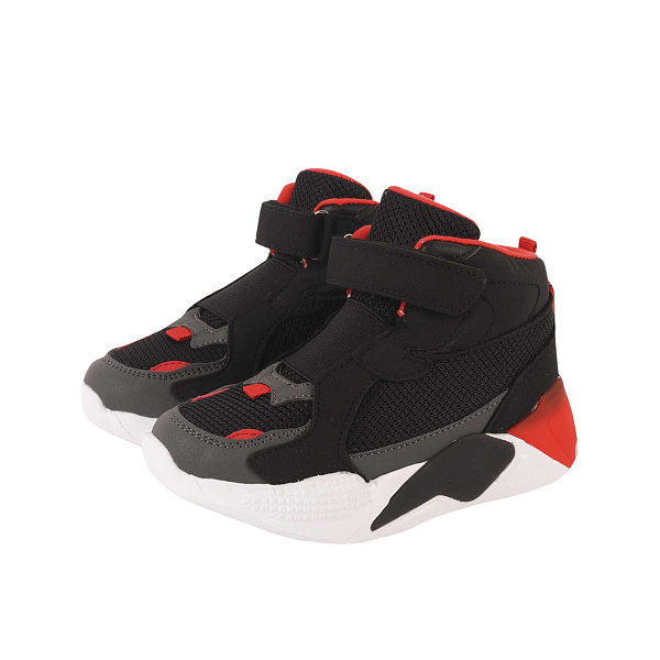 Утепленные ботинки из искусственной кожи в сочетании с текстилем – красивое и удобное решение на каждый день. Белую подошву с декоративным рантом, черными и красными вставками легко мыть.