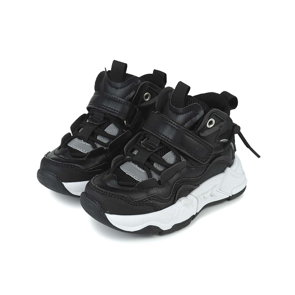 Верх детских ботинок черного цвета выполнен из текстильной ткани с фигурными вставками из искусственной кожи. Стельки и подкладки из текстиля (80% хлопка, 20% полиэстера) сохраняют ноги в тепле и сухости. Язычок помогает защитить ноги от ветра и холода.
