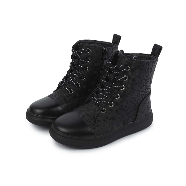 Детские высокие ботинки для девочек дошкольного возраста. Модель выполнена в универсальном черном цвете с абстрактным матовым рисунком. Обувь с декоративной шнуровкой и застежками на молнии сбоку. У ботинок классический внешний вид, который будет сочетаться и с брюками, и с юбками.