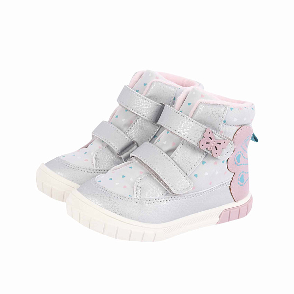 Утепленные ботинки для девочки ясельного возраста оформлены в нежной цветовой гамме, украшены бабочками и сердечками. Модель подчеркивает трогательный образ малышки, отвечает всем ее потребностям. Пара ремешков с липучками предельно упрощает процесс переобувания, обеспечивает регулировку полноты и надежную фиксацию изделия на ноге. Широкий язычок и мягкий верхний край гарантируют комфортную посадку. Усиленный фигурной накладкой задник создает все условия для правильной постановки стопы.