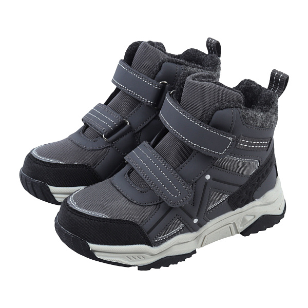 Эти стильные утепленные ботинки для мальчика выполнены в практичном сером цвете с контрастными черными и светло-серыми вставками, что придает им современный спортивный вид. Удобная система из двух широких застежек-липучек обеспечивает легкое и быстрое обувание, а также надежную фиксацию на ноге. Высокий верх с мягким воротником из теплого материала и задняя петелька для удобства надевания дополняют функциональность. Массивная двухцветная подошва с выраженным протектором гарантирует отличное сцепление и устойчивость.