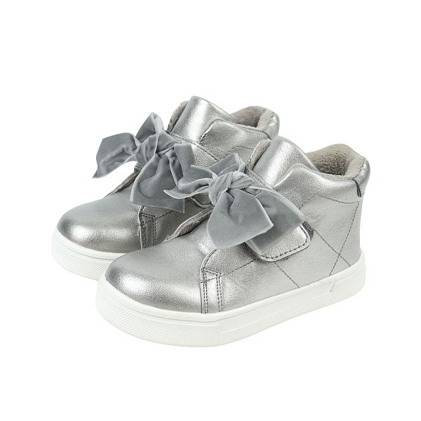 Блеск серебра мягкой искусственной кожи делает эту модель ботинок желанной в гардеробе маленькой девочки. Нейтральный цвет органично комбинируется с одеждой спокойных оттенков, а классический фасон подойдет как для комплектов с брюками и джинсами, так и с юбками. Подошва у ботинок белого цвета, прорезиненная и утолщенная, чтобы надежно защитить ноги от влаги и холода. Внутренняя поверхность ботинок серая байковая, очень приятная на ощупь, отлично согревает. В качестве застежки используется скрытая липучка на ремешке, украшенном большим бархатным бантом.