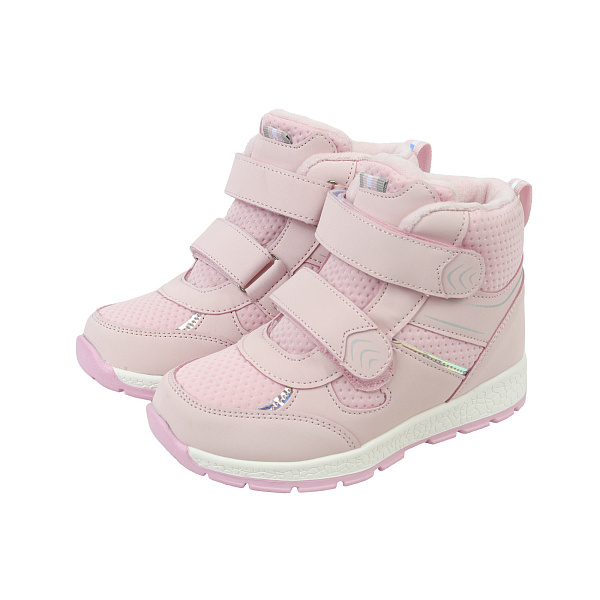 Детские утепленные ботинки для девочек. Модель в розовом цвете с небольшими блестящими вставками. Благодаря удобным застежкам на липучках малышка сама сможет надевать и снимать обувь. Верх изделия выполнен из текстильного дышащего материала и искусственной кожи, обеспечивающей ноге дополнительную защиту. Внутри – хлопчатобумажная стелька, которая пропускает воздух, давая коже ног дышать.