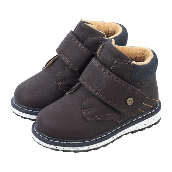 Коричневые ботинки предназначены для мальчиков ясельного возраста. Они легко надеваются благодаря простой застежке-липучке. Верх из искусственной кожи с текстурой под кожу. Подошва белая с коричневыми вставками. Ботинки предназначены для прогулок в холодную погоду в межсезонье.