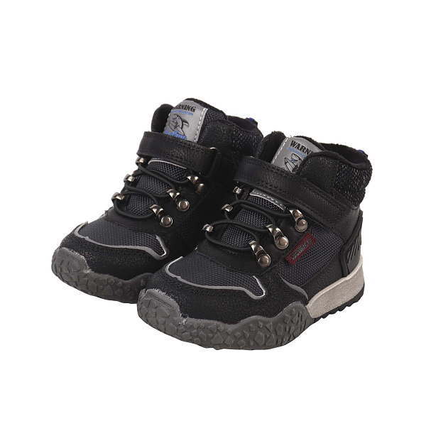 Утепленные ботинки для мальчишек ясельного возраста идеальны для холодного времени года. Оформлены в элегантном черном цвете с контрастными серыми элементами. Изготовлены из качественного текстиля и искусственной кожи, обеспечивая долговечность и устойчивость к износу.
