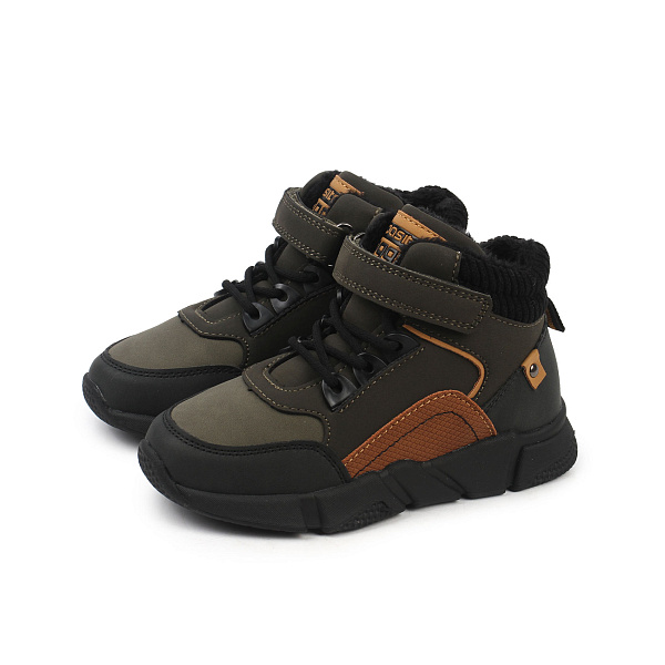 Утепленные ботинки для мальчика выделяются модным дизайном и практичностью. Оттенок хаки с контрастными коричневыми вставками создает стильный и современный образ. Высокая мягкая манжета с вязаной отделкой надежно защищает голеностоп и придает дополнительный комфорт. Комбинация шнурков и липучки помогает легко и быстро зафиксировать обувь на ноге.