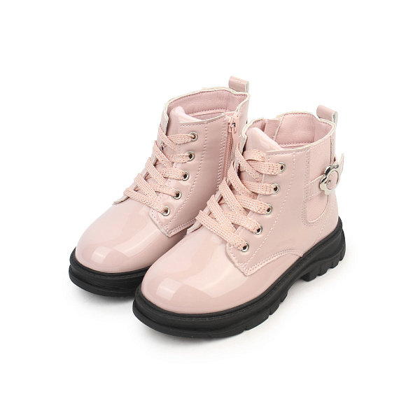 Утепленные ботинки для девочки выполнены в нежно-розовом цвете с эффектом глянца, что придает модели стильный и аккуратный вид. Обувь украшена декоративным металлическим элементом в виде цветка на ремешке, а классическая шнуровка дополнена удобной застежкой-молнией для быстрой и удобной фиксации.