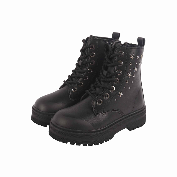 Утепленные ботинки позволят девочке дошкольного возраста сохранить ноги сухими и теплыми в межсезонье. Модель в полной мере отвечает базовым потребностям ребенка, разработана с учетом модных тенденций. Она привлекает внимание лаконичным дизайном и металлическими украшениями в виде звезд и окружностей. Традиционная боковая молния дополнена шнуровкой. Такая схема упрощает процесс переобувания, позволяет скорректировать полноту. Широкий язычок не пропустит внутрь холод и влагу, обеспечит комфортную посадку.