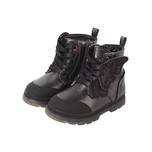 Теплые ботинки для девочек в черном цвете, выполненные из искусственной кожи. Украшены оригинальной аппликацией в виде черных блестящих крыльев. Ботинки обладают прочной термопластичной резиновой подошвой, которая обеспечивает надежное сцепление и стабильность при ходьбе. Подкладка из хлопка и полиэстера (80% ХБ, 20% ПЭ) сохраняет тепло и комфорт в холодное время года.