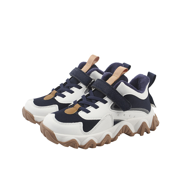 Утепленные ботинки для мальчика выполнены в стильной цветовой гамме: тёмно-синий текстиль гармонично сочетается с белыми вставками из искусственной кожи и коричневыми элементами подошвы и язычка. Модель имеет удобную застёжку-липучку и эластичные шнурки для надёжной фиксации ноги. Внутренняя часть ботинок утеплена мягким тёмно-синим подкладом, который обеспечивает тепло и комфорт при носке.