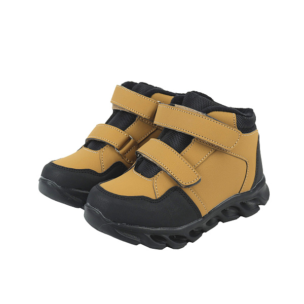 Утепленные демисезонные ботинки будут надежно защищать ноги мальчика-дошкольника ранней весной и поздней осенью. Ботинки пошиты из искусственной кожи и текстиля, подкладка и стелька выполнены из хлопчатобумажной ткани. Подошва кроссовочного типа с глубоким рифлением. Носок усиленный, предохраняющий пальцы ног от ушибов. Ботинок плотно крепится на ноге двумя застежками-липучками. Усиленный задник стабилизирует голеностоп при ходьбе, а упругая подошва из ЭВА равномерно распределяет нагрузку при ходьбе и не утяжеляет ботинок. Цвет изделия – комбинация светло-коричневого и черного. Утолщенная подошва дополнена светодиодами, которые ярко мерцают во время ходьбы.