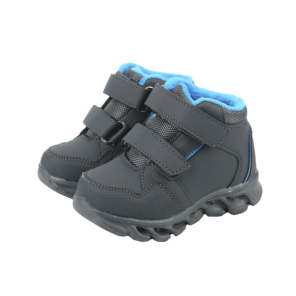Зимой и в межсезонье утепленные ботинки являются обязательной частью гардероба малыша. Ботинки для мальчиков ясельного возраста имеют прочную полимерную светящуюся подошву из ЭВА с рифленой подметкой. Материал верха – искусственная кожа и текстиль. Длинный язычок предохраняет от попадания внутрь снега и воды. Конструкция задника и носовой части плотно фиксирует ногу, но не стесняет движений. Ботинки застегиваются двумя липучками, прочно фиксирующими его на ноге. Подкладка обуви меховая, стельки утепленные. Цвет – темно-синий. Рельефная утолщенная подошва дополнена светодиодами, во время ходьбы они ярко мерцают и повышают безопасность в темное время суток.