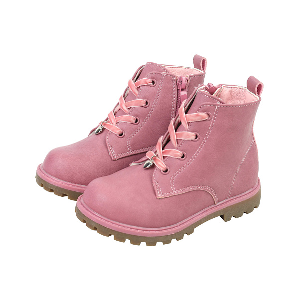 Розовые демисезонные ботинки из искусственной кожи согреют ноги малышки на прогулках. Верх обуви выполнен из искусственной кожи розового цвет. Внутри имеется флисовая подкладка, стельки утеплены хлопчатобумажной тканью. Фиксируется ботинок на ноге с помощью шнурка на голенище, на шнуровке зафиксирован золотистый медальон. На боковой поверхности для облегчения и ускорения обувания имеется замок-молния.