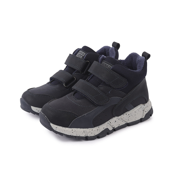 Стильные ботинки с одобрением примет любой мальчик дошкольного возраста. Модель оформлена в спортивном стиле с применением практичной цветовой гаммы. Простая застежка в виде двух ремешков с липучками предельно ускорит процедуру переобувания, обеспечит надежную фиксацию. Она продублирована боковой молнией. Широкий язычок защитит от осадков и холода. Высокий задник имеет мягкую окантовку по верхнему краю. Он гарантирует правильное положение стопы при ходьбе, не давит на пятку.