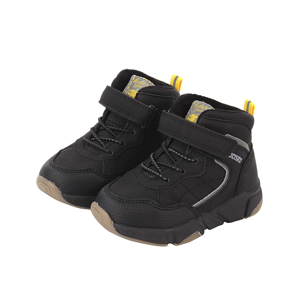 Утепленные ботинки выполнены в черном цвете, подходящем для холодных сезонов. Верх изделия изготовлен из прочной искусственной кожи, обеспечивающей долговечность и защиту от влаги. Декоративная шнуровка и застежка-липучка добавляют удобства и стильности, позволяя легко надевать и снимать обувь. Светоотражающие элементы улучшают видимость в темное время суток, повышая безопасность ребенка.
