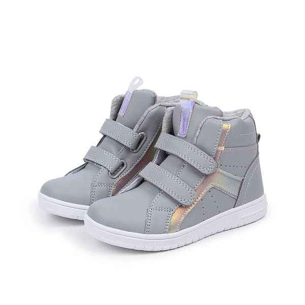 Стильные ботинки серого цвета для девочек ясельного возраста изготовлены из прочной и влагостойкой кожи, а отделка подкладки выполнена текстильным материалом на основе натурального хлопка. В качестве элементов отделки использованы глянцевые розовые вставки. Ботинки чудесно переносят чистку и просты в уходе. Для комфортного самостоятельного обувания на передней поверхности размещены две прочные застежки-липучки, которые плотно фиксируют обувь на ноге. Подошва спортивного типа имеет ребристый рисунок, который препятствует скольжению на асфальте или плитке.