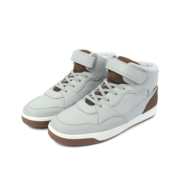 Высокие ботинки спортивного типа для мальчиков школьного возраста. Модель серого цвета с коричневыми вставками. Такое сочетание цветов смотрится эффектно и подойдет под разные стили и оттенки одежды. Внешний вид обуви напоминает популярные и модные кроссовки, поэтому мальчишки обязательно оценят их крутой дизайн. У ботинок два типа застежек: шнурки и липучка. Плотная пятка помогает поддерживать стопу в правильном положении при ходьбе.