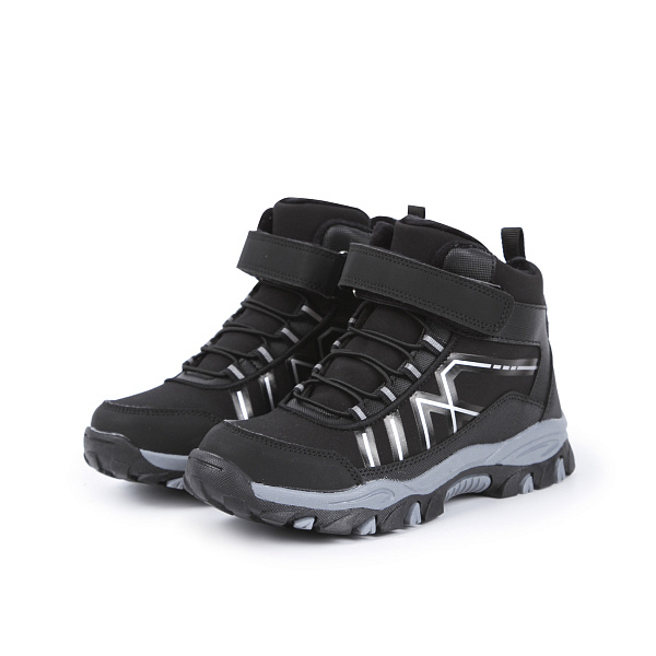 Активные ребята предпочитают обувь спортивного стиля, такие утепленные демисезонные ботинки удовлетворят даже взыскательный вкус. В изготовлении ботинок использована комбинация кожи и текстиля. Подошва выполнена из термопластичной резины. Она высокая, имеет глубокий протектор и подъем к носку. Манжет задника удобно охватывает голеностоп и дает возможность свободно двигаться без опасения натереть ногу. Завязываются ботинки шнурками, пропущенными через металлические скобы, верх закрывается застежкой-липучкой. Цвет ботинок черный с белой окантовкой деталей обуви, подошва – серая.