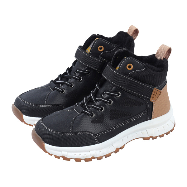 Утепленные ботинки для мальчика школьного возраста имеют черный цвет с коричневыми вставками. Ботинки подходят для холодной погоды в межсезонье. Ботинки быстро и удобно надеваются благодаря прочным шнуркам и липучке. Шнурки позволяют регулировать посадку, а липучка упрощает надевание.