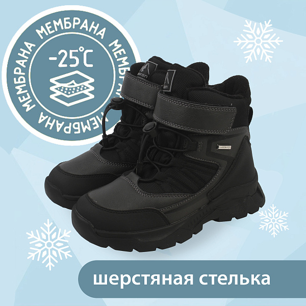 Утепленные ботинки для мальчика выполнены в черном цвете с контрастными серыми вставками и современным спортивным дизайном. Высокий берец с гибкой шнуровкой и застежкой-липучкой обеспечивает удобную и быструю фиксацию обуви на ноге. Модель выглядит прочной и устойчивой, с толстой подошвой и глубоким протектором для надежного сцепления на скользких поверхностях. Отличный выбор для зимних прогулок и активных игр.