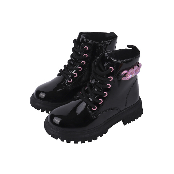 Утепленные ботинки для девочек выполнены в черном цвете из искусственной кожи с глянцевым покрытием, что придает им модный и современный вид. Яркие розовые акценты на люверсах и стильная цепочка на боковой части придают обуви оригинальность и выделяют среди других моделей.