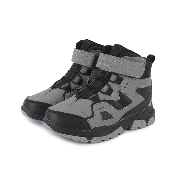Серо-черные утепленные ботинки — отличный вариант для мальчика-дошкольника. В верхней части сочетаются серые и черные детали из искусственной кожи и текстиля. Мысок и пятка усилены. Их практически невозможно сбить даже во время активных игр.
