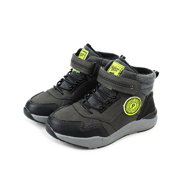 Отличным дополнением осенне-весеннего гардероба дошкольника станут ботинки на липучке. Модель привлекает внимание дизайном в стиле кэжуал. Особый вид обуви придают графические элементы неонового желтого цвета. Скорректировать посадку на ноге помогут шнурки. Верх изделия изготовлен из искусственной кожи с текстильными вставками. В составе подкладочного материала и стельки присутствует 80% хлопкового волокна. В меру упругая подошва из ТПР равномерно распределяет нагрузку на стопу, препятствует скольжению.