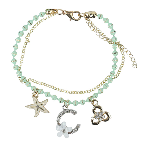 Этот детский браслет станет отличным дополнением к коллекции аксессуаров маленькой модницы. Тонкая золотистая цепочка в дуэте с крупными бусинами подчеркнет изящность детских запястий. В центре композиции — металлические подвески, подчеркивающие стиль девочки. Браслет застегивается без чужой помощи, легко регулируется по размеру благодаря дополнительной цепочке и маленькому карабину.