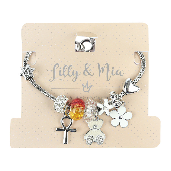 Этот детский браслет выполнен в стиле «пандора» и представляет собой комбинацию элегантной основы и шармов, то есть тематических подвесок и бусин. Браслет выполнен из серебристого металла с блестящей поверхностью и дополнен блестящими украшениями в форме цветных зверюшек. Застежка браслета регулируется под размер запястья ребенка.