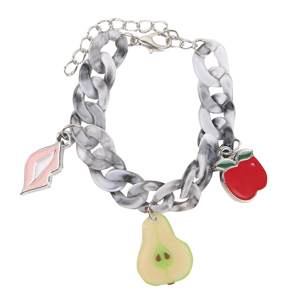 Браслет-цепочка — яркий и стильный аксессуар для юных модниц. Браслет состоит из крупных звеньев серого цвета, создающих интересный и запоминающийся образ. К нему прилагаются три подвески, которые добавляют особенный шарм: сочное красное яблоко, нежная зеленая груша и розовые губы.
