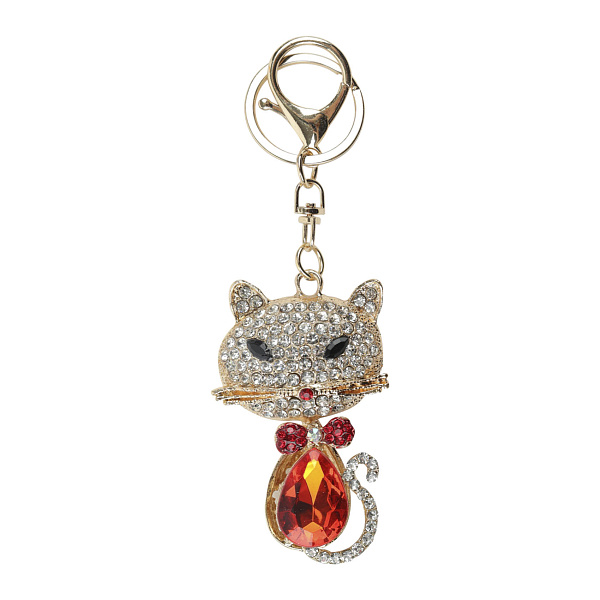 Оригинальный брелок в форме элегантной кошки подчеркнет индивидуальность ребенка и поможет выделить его ключи или сумку. Фигурка выполнена из золотистого металла и украшена множеством белых страз. Особое внимание привлекает яркий красный бант на шее и крупный камень, напоминающий настоящий рубин.