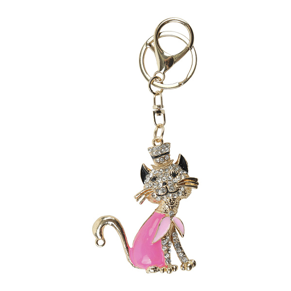Оригинальный брелок в форме элегантного котика в цилиндре подчеркнет индивидуальность ребенка и поможет выделить его ключи или сумку. Золотистый кот в розовой накидке украшен блестящими стразами, благодаря которым брелок переливается на свету.