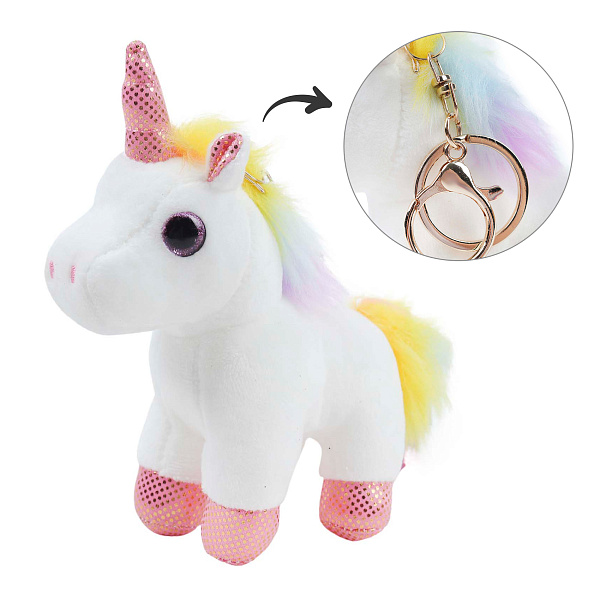 Мягкий брелок в виде единорога привлечет внимание яркими цветами и необычным дизайном. Белый корпус украшен разноцветной пушистой гривой и хвостом, а блестящие элементы на ногах и роге добавляют деталям выразительности. Игрушка имеет длину 15 см, что делает ее заметным и удобным аксессуаром.