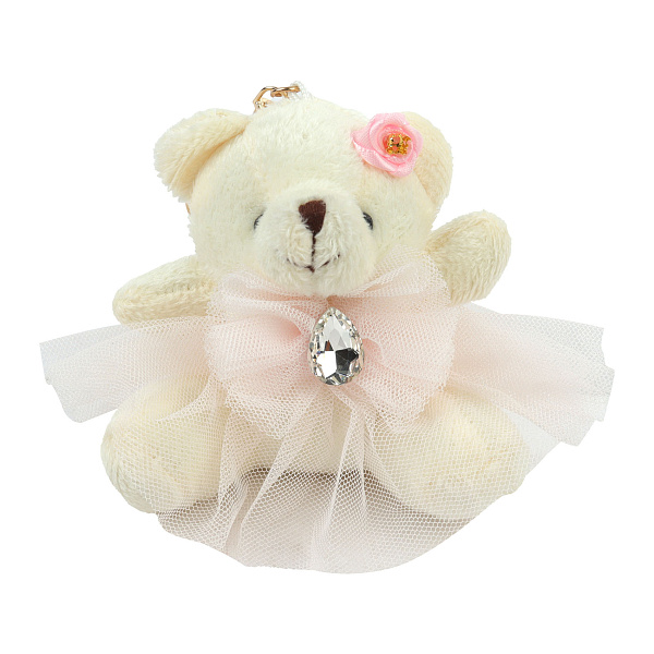 Использование брелоков помогает малышам легко находить свои вещи в детском коллективе, находить свой портфель среди нескольких похожих. Поэтому забавный медвежонок в бальном платье станет востребованным аксессуаром не только для детей старшего возраста, но и для малышей. Брелок изготовлен из мягкой микрофибры с коротким ворсом. Медвежонок одет в платье нежного цвета и украшен цветком в тон. К голове игрушки прикреплена съемная цепочка, на которой размещено кольцо для ключей и пристежной карабин.