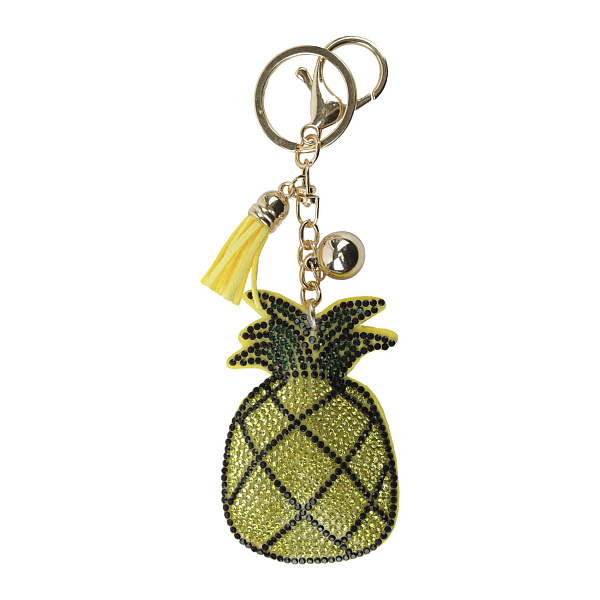 Брелок с мягкой фигуркой ананаса — это яркий аксессуар, который приносит тропическое настроение в повседневную жизнь. Разноцветные стразы передают текстуру экзотического фрукта. Желтая кисточка и металлический шарик на цепочке дополняет общую композицию украшения.
